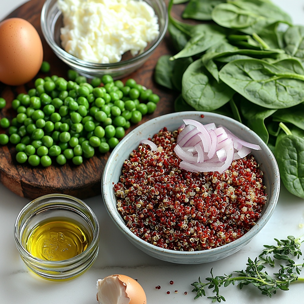 Warm the olive oil in a pan and gently cook the finely diced red onion and crushed garlic until fragrant and softened. Add the frozen peas and stir them as they thaw, then use a masher to lightly crush them, adding a delightful creamy texture to the mix. Toss in the chopped spinach and fresh thyme leaves, stirring everything together before removing the pan from the heat.