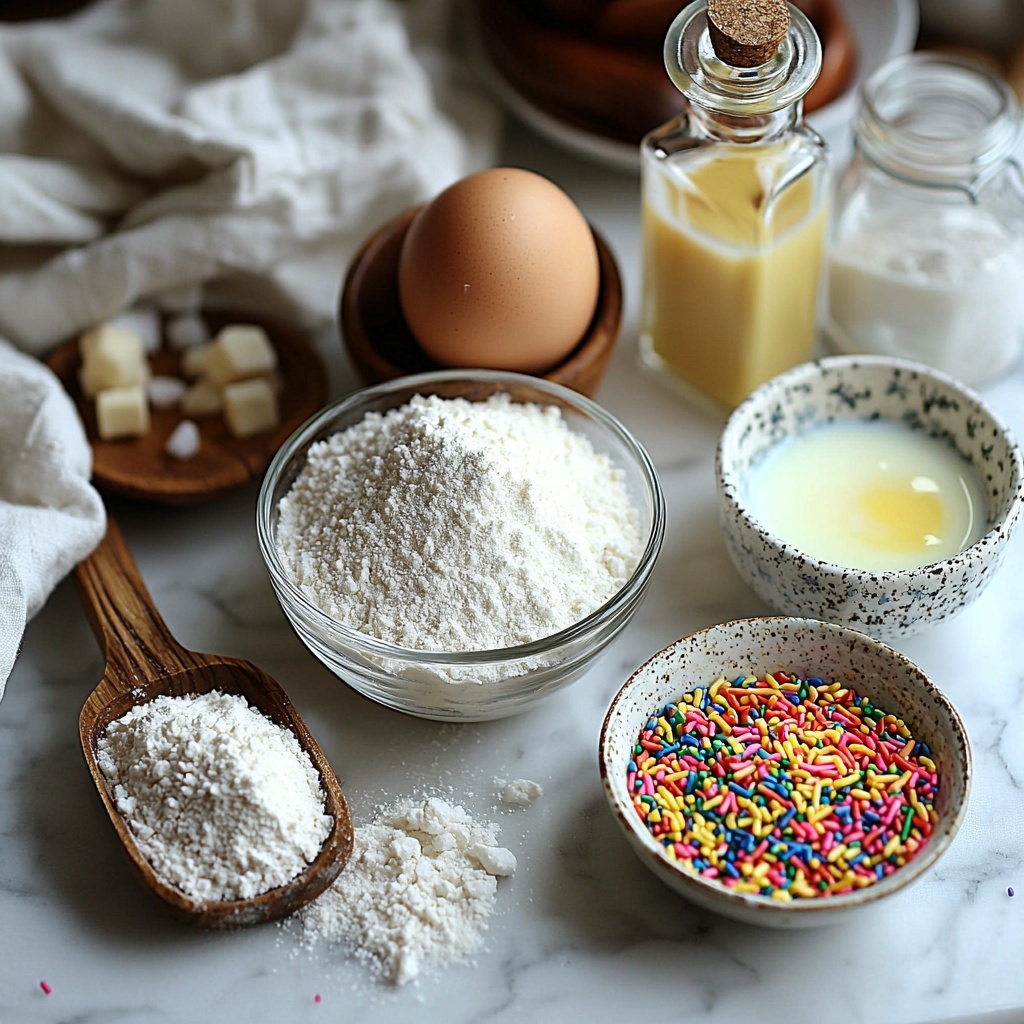 Getting ready to whip up the Rainbow Sprinkle Heart Pancakes Recipe means gathering some straightforward but essential ingredients. Each one plays a key role—flour and baking powder ensure those fluffy clouds of pancakes, sugar adds a subtle sweet touch, while rainbow sprinkles give each bite a fun pop of color and texture.