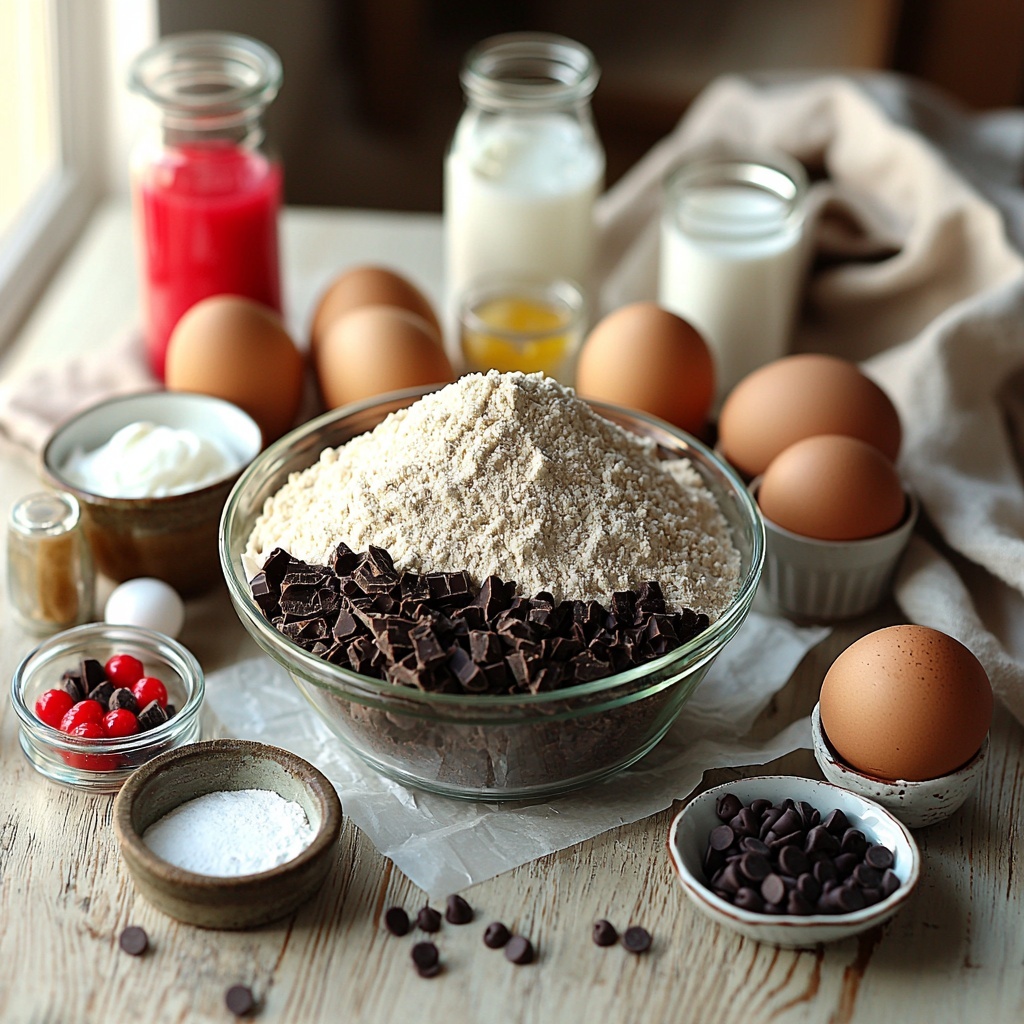 Gathering these straightforward but essential ingredients is the first step to creating your stunning Red Velvet Chocolate Chip Cake Recipe. Each element plays a key role, from the rich cocoa powder lending depth, to the red food gel dye that gives the cake its iconic vibrant color and the mini chocolate chips for delightful bursts of chocolatey goodness.
