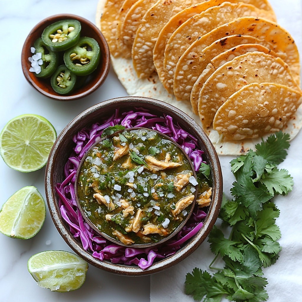 A quick and flavorful recipe for Salsa Verde Chicken Tostadas featuring tender chicken simmered in a zesty salsa verde, topped with fresh lime cabbage slaw, melted Mexican cheese, and optional pickled jalapeños, all served on crispy tostada shells. Perfect for a light and tasty meal ready in about 20 minutes.