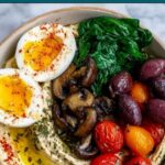 This Savory Breakfast Bowl recipe combines perfectly cooked eggs, sautéed mushrooms, cherry tomatoes, and spinach with creamy hummus for a wholesome, nutrient-rich start to your day. Enhanced with garlic, olive oil, and flavorful seasonings like Aleppo pepper and za’atar, these bowls offer a delicious balance of protein, veggies, and Mediterranean-inspired flavors all ready in just 20 minutes.