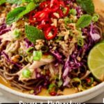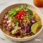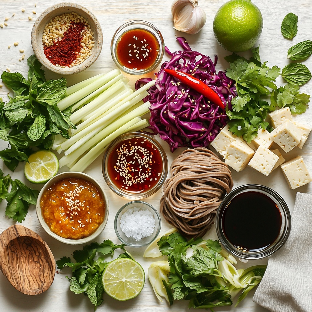 - Assemble the Salad: Drizzle some of the sesame chili dressing into the bottom of serving bowls. Add a portion of the dressed cold soba noodles, then sprinkle crumbled smoked tofu or cooked edamame on top. Drizzle additional sesame chili sauce over the noodles and protein. Add a generous scoop of the cabbage slaw on top. Garnish with torn mint and chopped cilantro leaves. Serve immediately with lime wedges on the side for extra brightness. Enjoy!