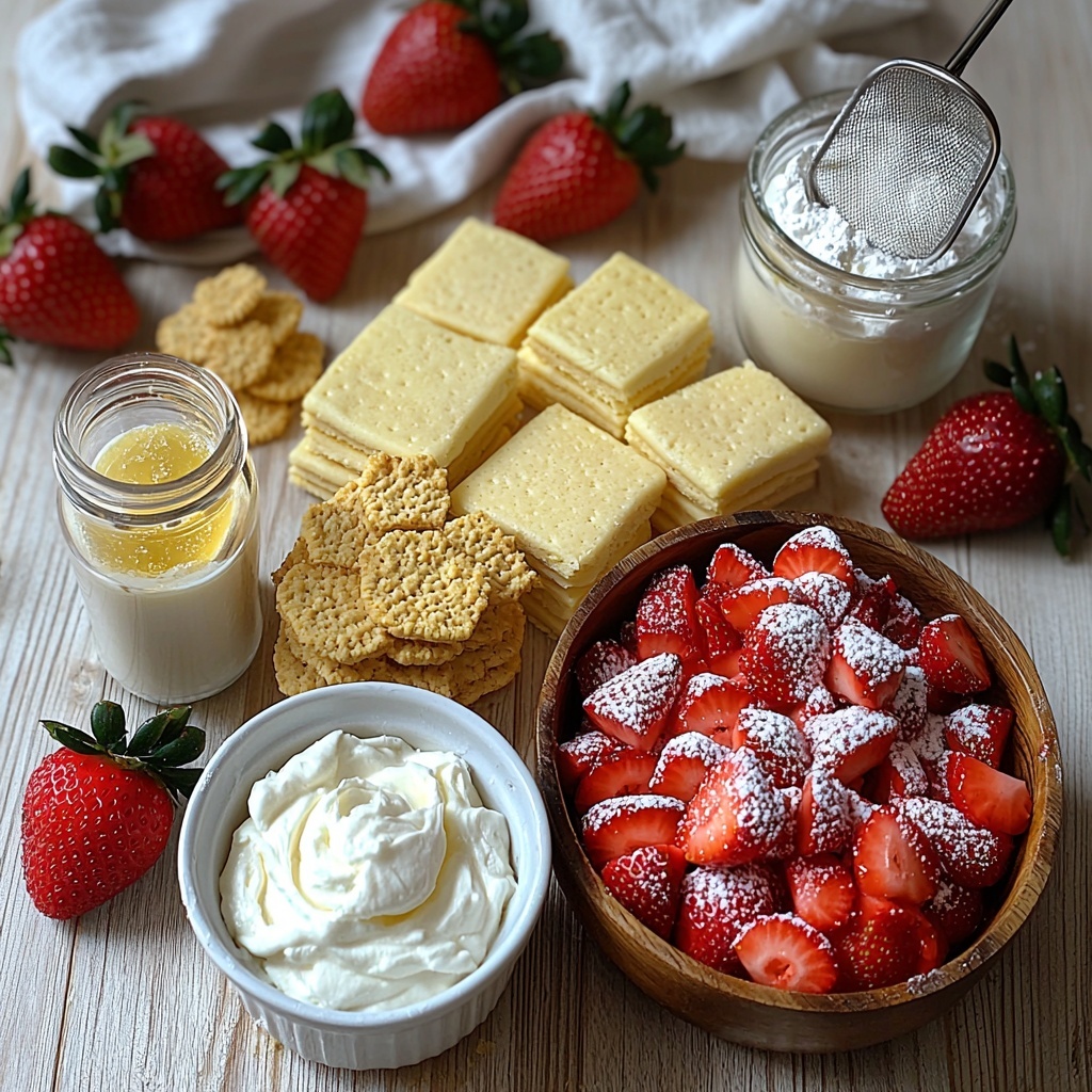Gathering these simple but essential ingredients is the first step toward creating this scrumptious dessert. Each component plays a star role: creamy texture from the cream cheese and whipped cream, natural sweetness and color from fresh strawberries, and a lovely crunch brought by crushed shortbread cookies or graham crackers.