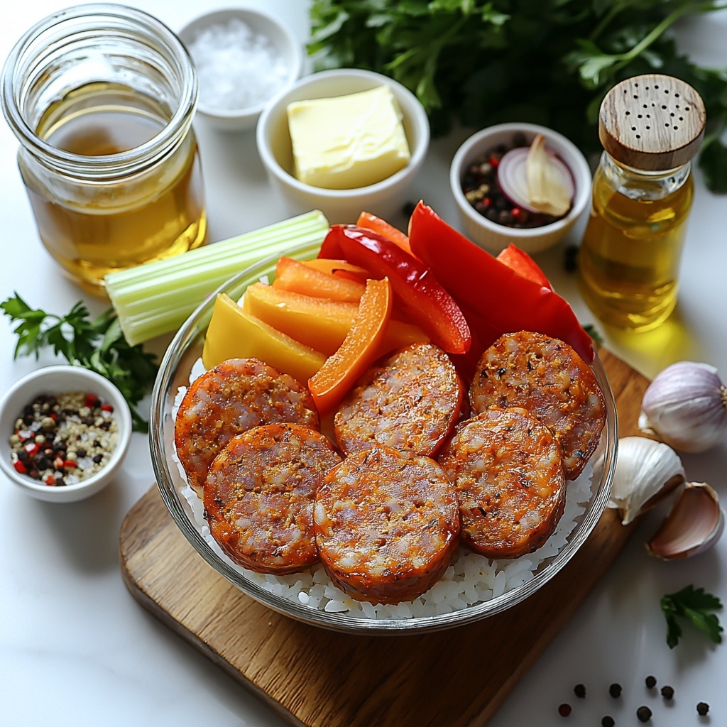 Getting this recipe just right means gathering some simple but essential ingredients that each play a special role. From the smoky depth of the sausage to the brightness of the vegetables and the tender fluffiness of the rice, every element works harmoniously to create something truly memorable.