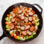 - Sauté Vegetables: Add the chopped yellow onion, red bell pepper, and celery to the skillet with the sausage. Cook until the vegetables start to soften, approximately 2 to 3 minutes. Then stir in the minced garlic and cook until fragrant, about one minute.