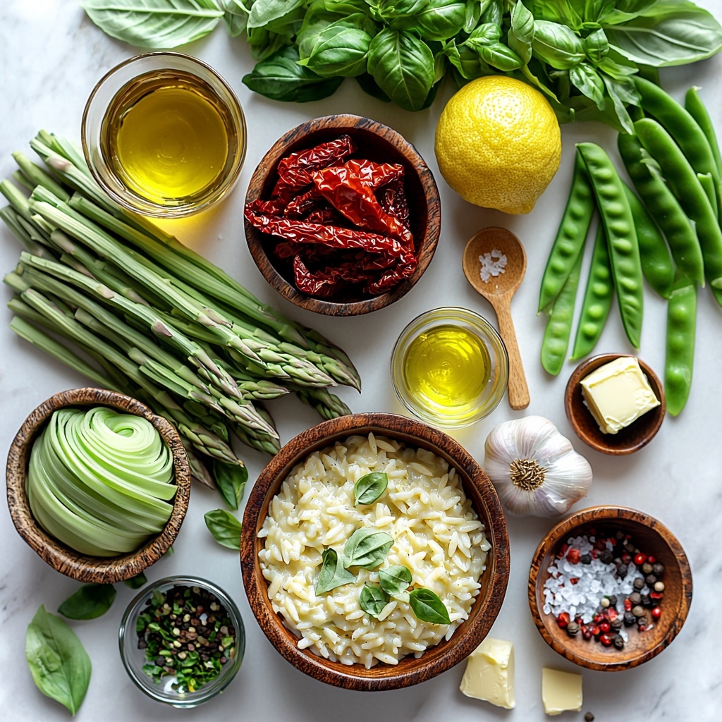 A vibrant and creamy spring orzotto featuring tender orzo pasta, fresh asparagus, snap peas, and a zesty sun-dried tomato pesto. This vegan-friendly dish is infused with fresh basil, garlic, and lemon, creating a bright and flavorful meal perfect for springtime dinners.