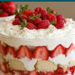 This classic trifle recipe features layers of fluffy white cake soaked in sherry or orange juice, fresh strawberries mixed with raspberry jam, a rich homemade custard, and a cloud of whipped cream, all beautifully assembled in a glass trifle dish. Garnished with maraschino cherries and slivered almonds, this dessert is perfect for gatherings and needs several hours of refrigeration to meld flavors.