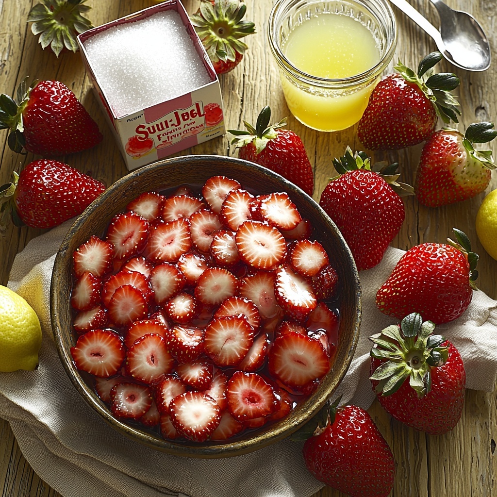 Gathering your ingredients for the Strawberry Freezer Jam Recipe is refreshingly simple, but each component plays a crucial role in achieving that perfectly balanced flavor and texture. From the luscious strawberries to the citrus zing of lemon juice, every item ensures your jam turns out just right every time.