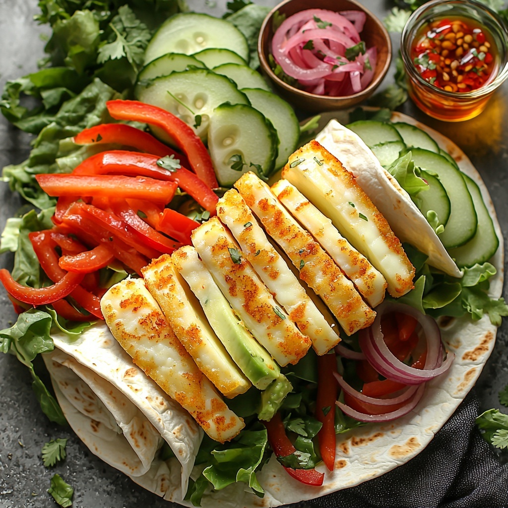 - Assemble the wraps: Lay out each tortilla wrap and spread a thin layer of sweet chili sauce evenly across the surface. Place crispy halloumi slices onto each wrap, followed by the prepared vegetables, avocado, fresh herbs, and pickled vegetables as desired.