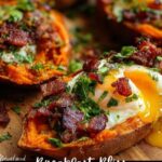 Sweet Potato Breakfast Boats with Bacon and Egg are a delicious and nutritious morning meal featuring roasted sweet potato halves filled with a perfectly baked egg, crispy bacon, and topped with fresh herbs, cheese, and avocado. This easy, oven-baked recipe offers a flavorful and balanced start to your day.