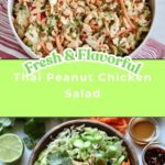 A vibrant and flavorful Thai Peanut Chicken Salad combining tender shredded chicken, crunchy cabbage and carrots, fresh herbs, and a creamy, spicy peanut dressing. Perfect for a quick, healthy meal that bursts with authentic Thai-inspired flavors and a zesty kick from fresh chili peppers and lime.