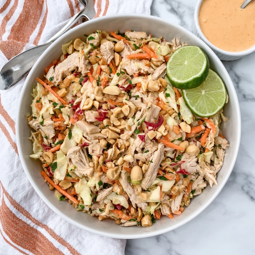 Pour the creamy peanut dressing over the tossed salad ingredients and gently stir to coat everything evenly. You’ll notice how the rich dressing lovingly clings to every shred of cabbage and carrot, wrapping the chicken in a comforting layer of flavor. Serve it immediately with lime wedges alongside to squeeze over the top, adding a burst of brightness right before every bite.