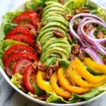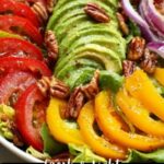 A vibrant and refreshing spring mix salad featuring marinated red onions, creamy avocado, juicy heirloom tomatoes, toasted gluten-free panko breadcrumbs or pecans, freshly grated parmesan cheese, and a zesty lemon garlic dressing. Perfect for a quick, nutritious, and flavorful meal or side dish.