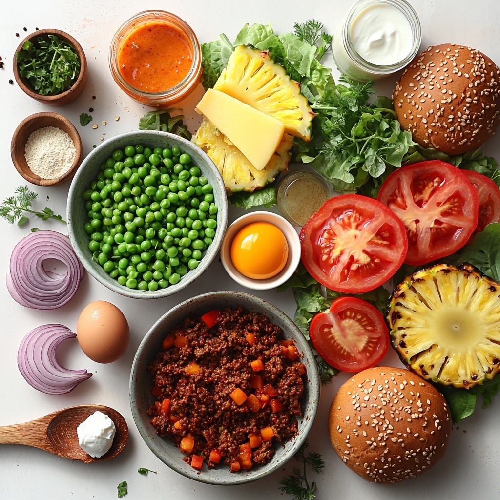 Layer your cooked burger on a warm bun, top with a grilled pineapple slice, a generous dollop of the spiced yogurt sauce, crisp lettuce, and juicy tomato slices. Each bite is a celebration of tropical, savory, and spicy flavors in perfect harmony.