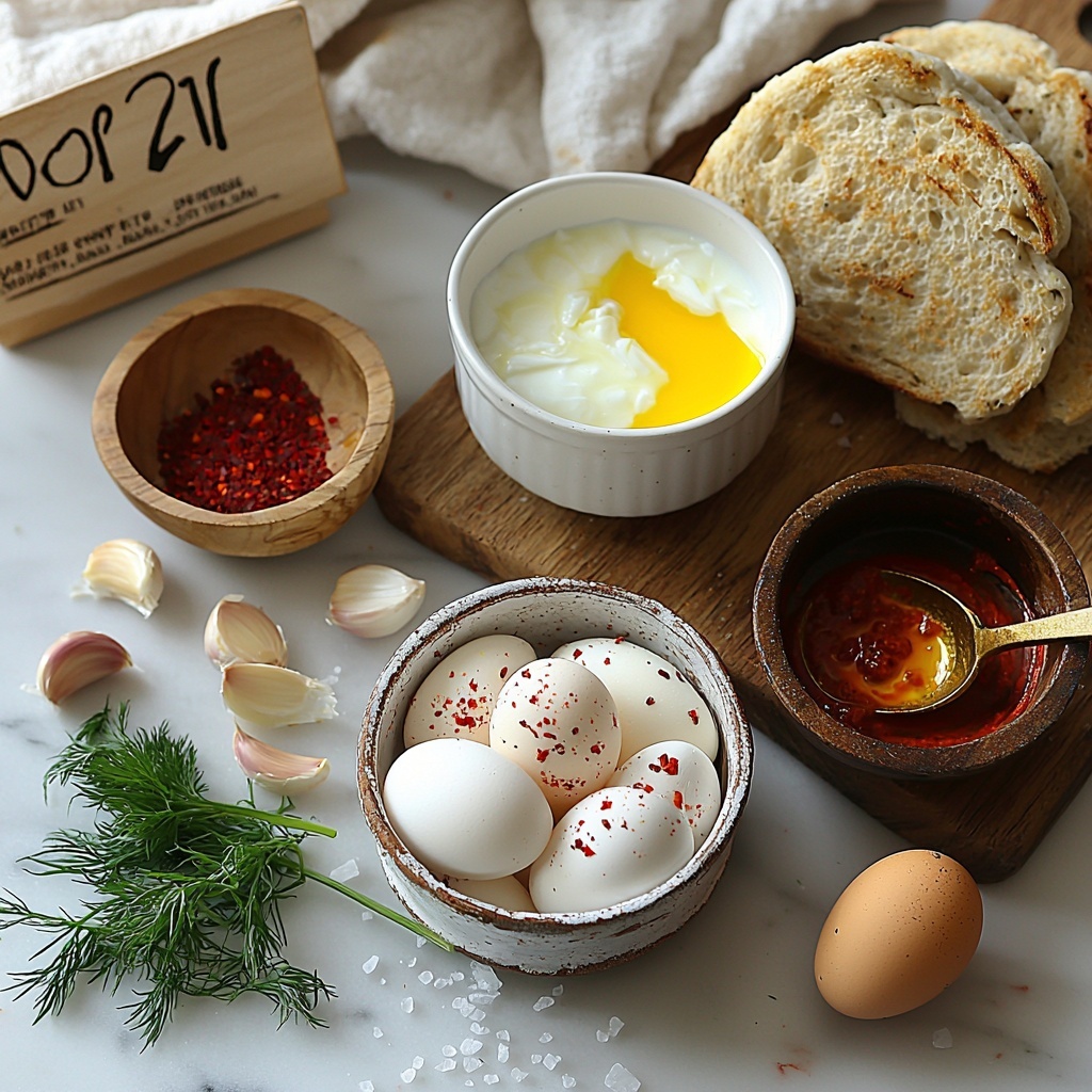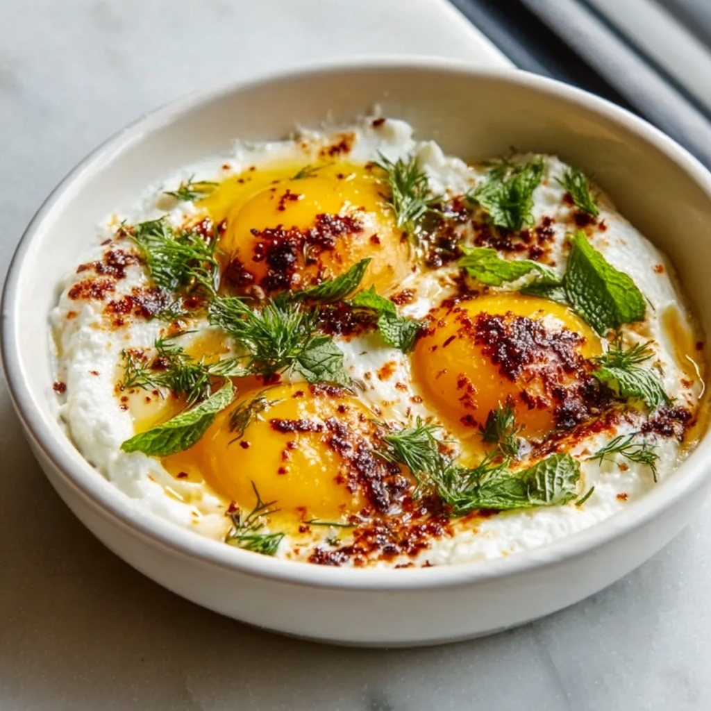 - Assemble the Dish: Spoon a generous amount of the garlicky yogurt onto a shallow serving plate. Gently place the poached eggs on top of the yogurt. Drizzle the spiced melted butter over the eggs and yogurt evenly. Garnish with fresh dill or mint if desired. Serve immediately with crusty bread, pita, or sourdough for dipping.