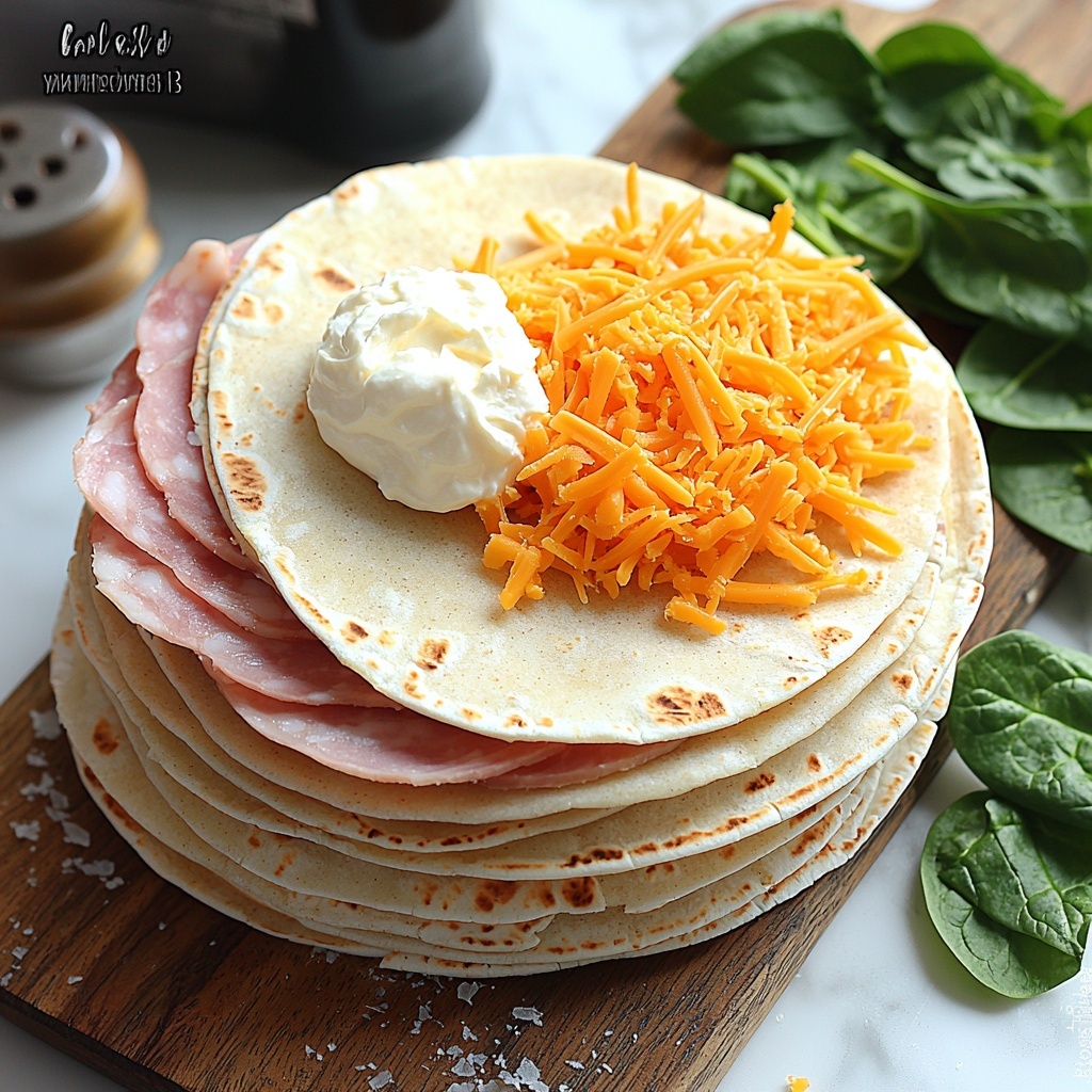 On top of the cream cheese, layer the deli ham evenly. Then sprinkle shredded cheddar cheese across, and finally, add fresh spinach leaves. This combination delivers savory, cheesy, and fresh flavors along with varied textures that make each bite exciting.