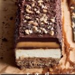 Freeze the entire assembled bar for at least six hours or overnight until it becomes solid enough to handle. Carefully remove it from the tin while frozen, pour melted vegan chocolate over the top, and use a spatula to coat the sides beautifully. For an extra touch, sprinkle chopped peanuts atop the chocolate while it’s still glossy.